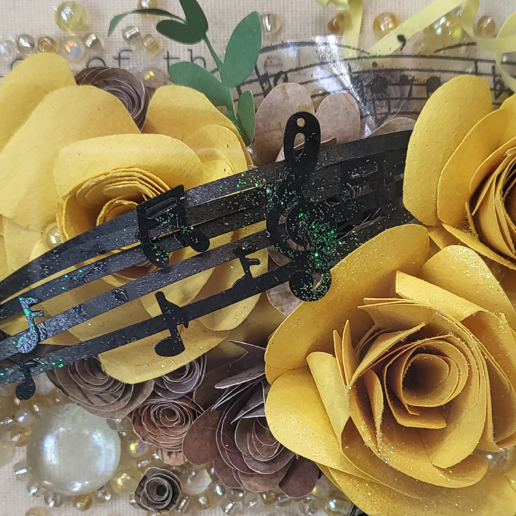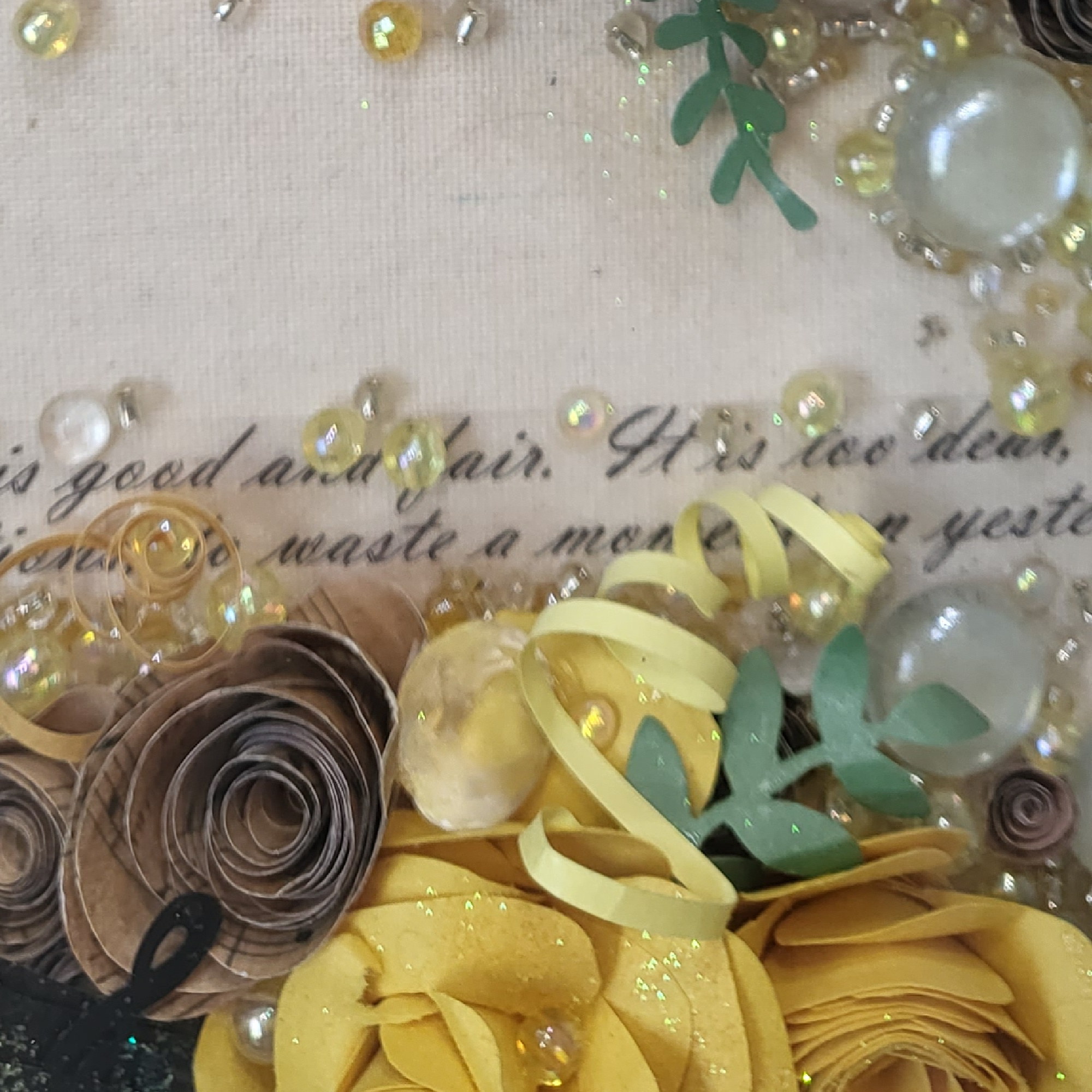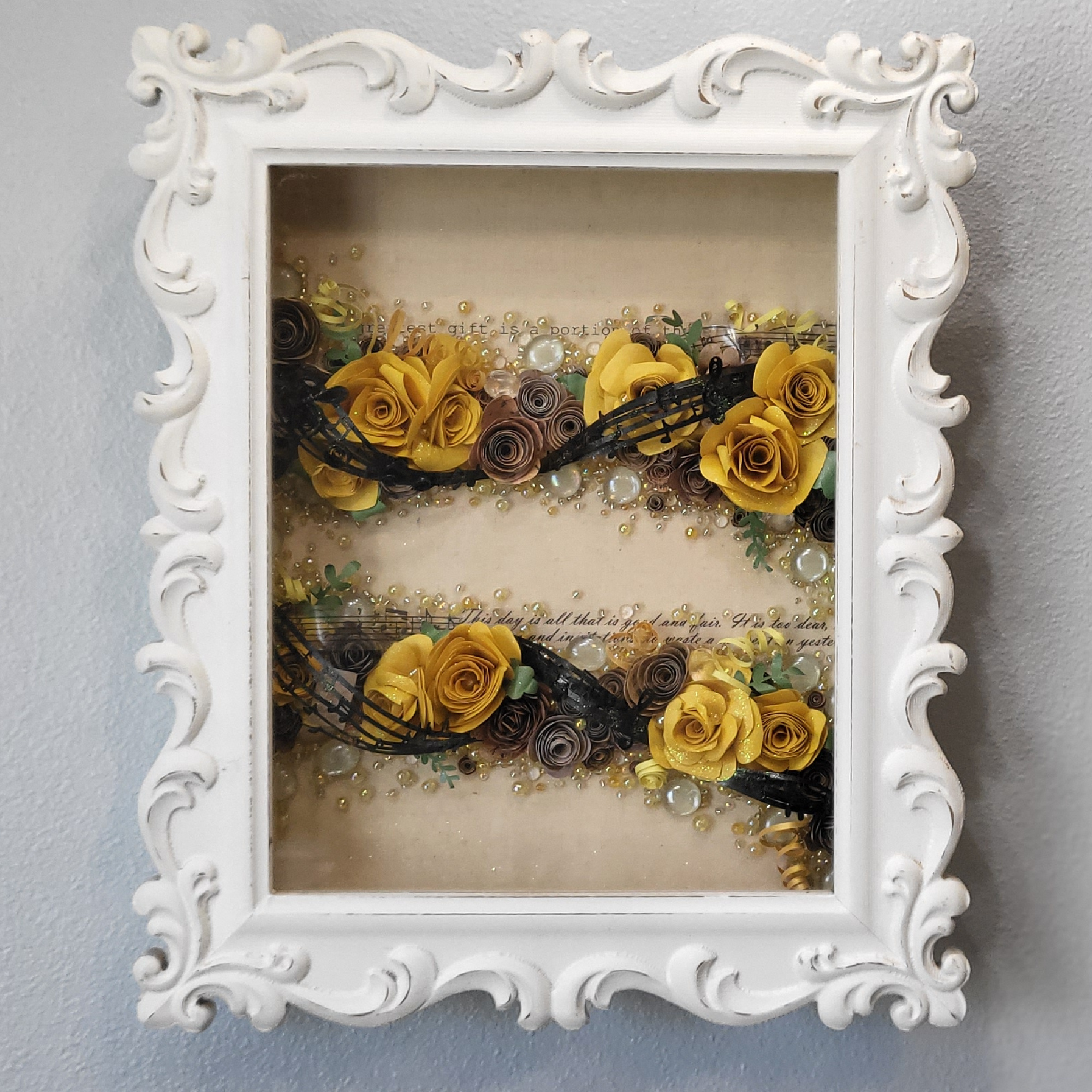 Size 19 x 16 x 3 inches. Framed in a rustic elaborate white wood shadow box. Beautiful yellow and gray flowers in two rows. This incredibly detailed piece boasts hundreds of glass bead bubbles, glass glitter flakes, and Swarovski rhinestones. The flowers were created with vintage-style printed paper and yellow solid paper. The unique feature of this piece is there are sheet music notes interwoven between the flowers.