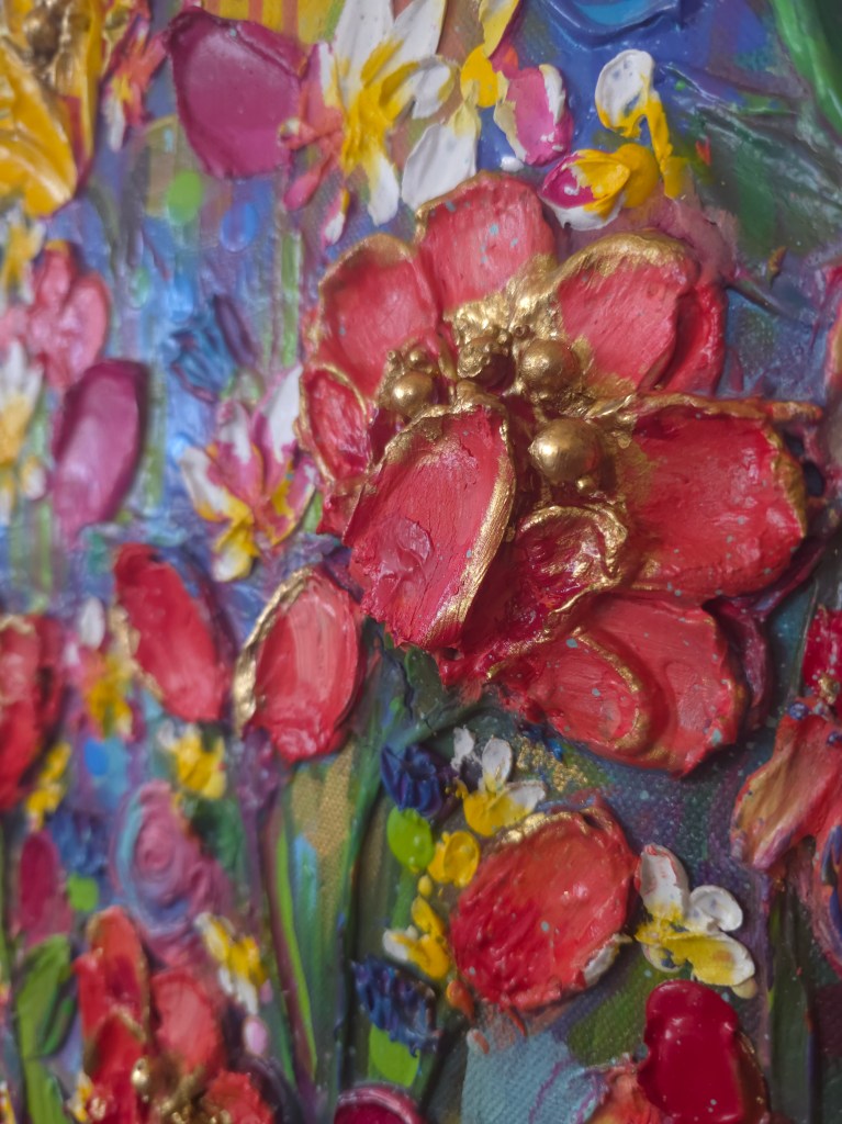 Size 20 x 10 Inches. Media textured acrylic paint & gold leaf on canvas. Created while playing with texture. Every color of the rainbow is in this piece. The colors reflect the true beauty of wildflowers. The larger flowers are texture painted and pop off the canvas. This piece also features gold leafing in some of the flower centers and edges.