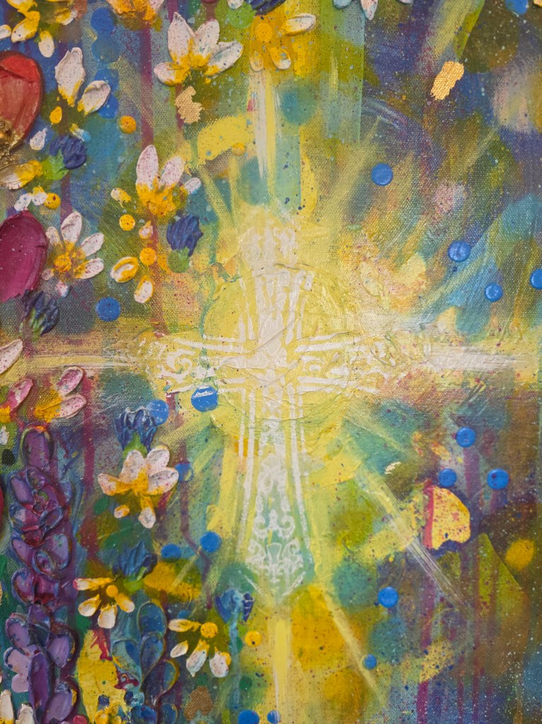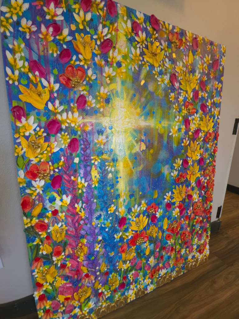 Size 48 x 36 Inches. Media Acrylic Paint & gold leaf on canvas. This piece was created using every color of the rainbow. It features bright vivid hues of red, pink, orange, yellow, green, blue & purples. This is a very large texture painting work. The flowers were created with modeling paste for the 3D effect. The piece features a cross set in the sunburst. The cross is an illusion because from a distance you can not see it. It is only when you get closer you can see the cross clearly. The detailing is done in intricate stippling dots of acrylic paint. This piece features gold leafing and gold striping for further detailing. The photos of this piece do not reflect the true beauty of this piece. This piece is currently on display at Dede’s Cafe in Hillsboro Oregon.